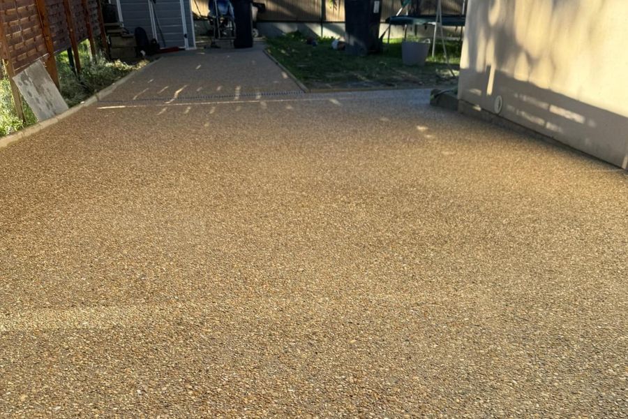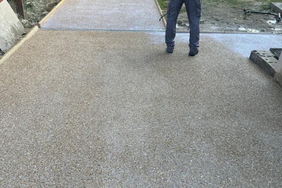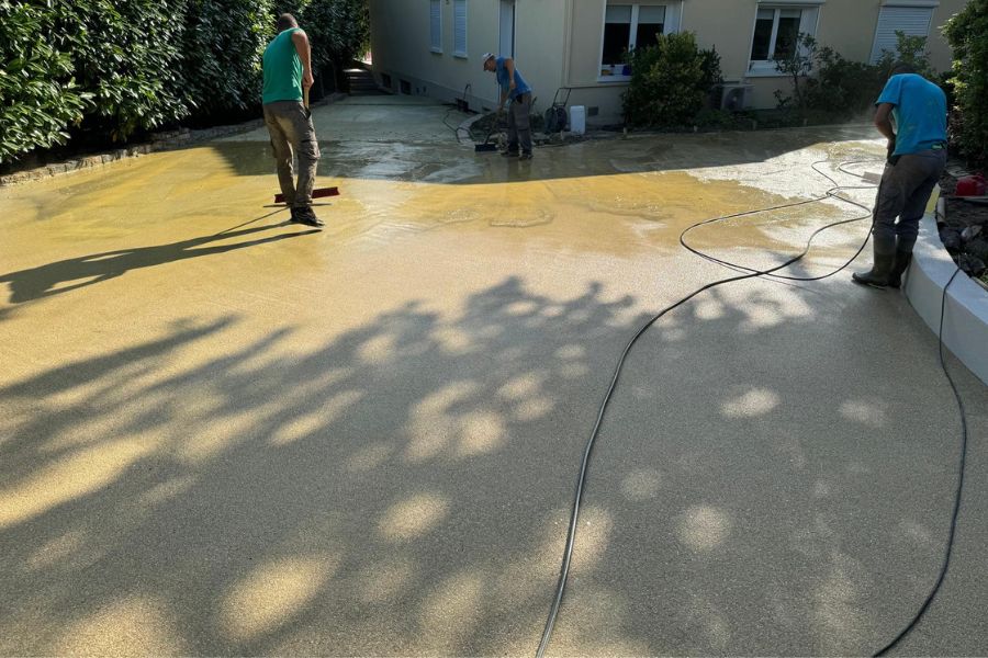 Le béton désactivé est un traitement qui consiste à éliminer la fine couche de ciment de surface juste après la mise en place du béton, afin de faire apparaître les granulats. Cette technique donne au sol un aspect décoratif naturel tout en garantissant une excellente adhérence.